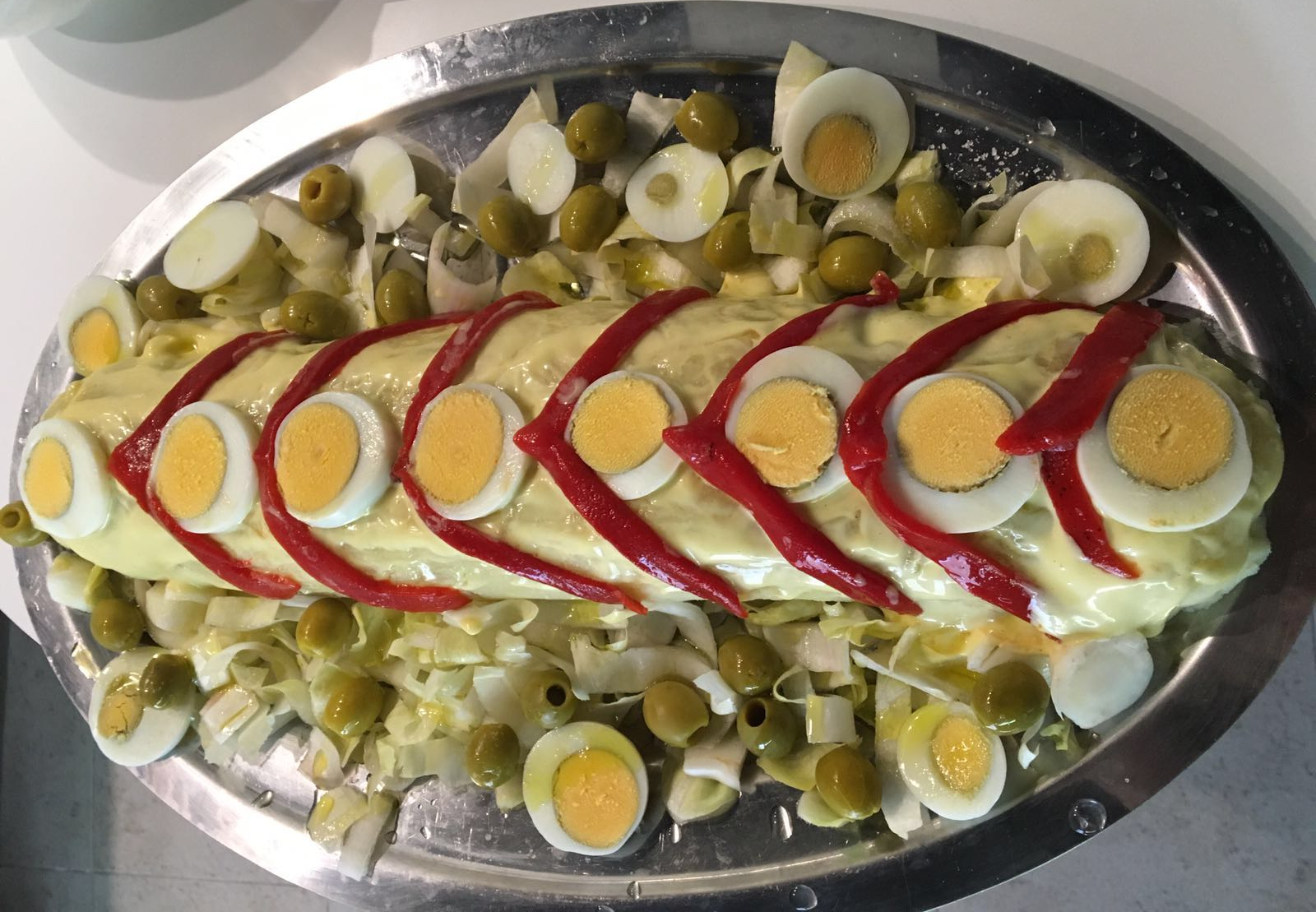 Passes el braç a una plata llarga i li afegeixes maionesa per sobre i ho adornes amb tires de pebrots (li pots fer la senyera …. queda guai …) i rotllanes d’ou dur.
